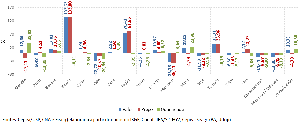 Para a batata (133,53%) e o tomate (37,71%), a projeção de elevação do faturamento anual é resultado apenas do aumento nos preços na comparação entre períodos, uma vez que há uma expectativa de leve redução nas produções para o ano. No caso da batata, a alta nos preços foi de significativos 133,80% na comparação entre períodos. Apesar de algumas quedas do preço no terceiro trimestre com a intensificação da colheita da safra de inverno, segundo a equipe Hortifrúti/Cepea, a alta nas cotações no ano como um todo foi sustentada pela baixa produtividade e pela redução na área plantada destinada ao cultivo na safra atual.