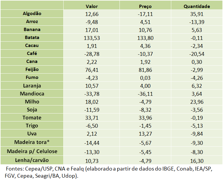 No caso dos produtos hortifrutícolas, o crescimento esperado nos faturamentos anuais da banana (17,01%) e da laranja (10,57%) é devido aos aumentos dos preços na comparação de janeiro a setembro de 2019 frente ao mesmo período de 2018 e às expectativas de maiores produções para o ano.
