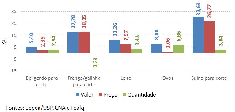 Para a bovinocultura do leite, a variação do faturamento anual é de 11,26%, impulsionada pelos aumentos no preço (7,57%) e na produção (3,43%). De acordo com a equipe Leite/Cepea, a alta nos preços é reflexo da baixa oferta registrada nos meses anteriores e, por consequência, maior competição pela matéria-prima por parte da indústria. Especificamente em setembro, os preços do leite ao produtor aumentaram frente a agosto, o que, segundo a equipe Leite/Cepea, é um movimento atípico, já que sazonalmente os preços recuam a partir de setembro. A equipe apontou que o atraso das chuvas no Sudeste e no Centro-Oeste limitou o aumento da oferta e levou ao cenário atípico de valorização dos preços.
