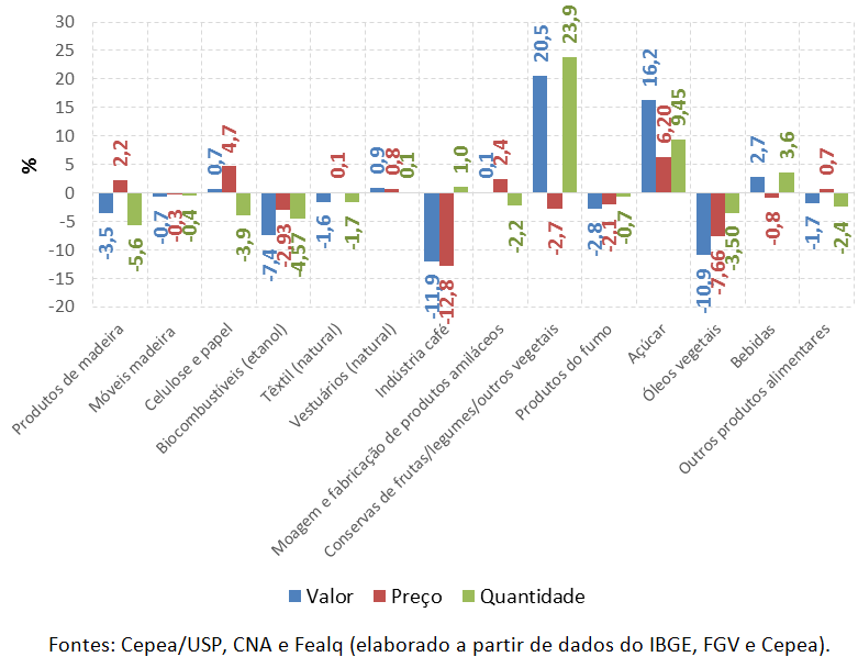 No acompanhamento da evolução do PIB realizado pelo Cepea, as indústrias de base agrícola que apresentaram projeção de crescimento do faturamento foram a de conservas de frutas/legumes/outros vegetais, de açúcar, de bebidas, de celulose e papel, de vestuário e de moagem. As demais indústrias registram perspectivas de redução (Figura 4).