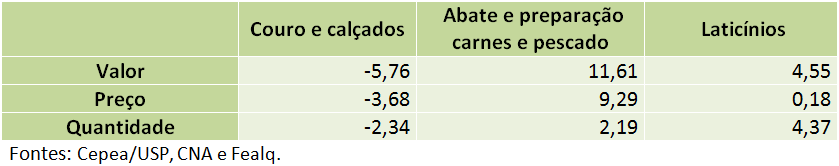 Tabela 5. Agroindústrias de base pecuária: variação anual do volume, preços reais e faturamento das indústrias pecuárias acompanhadas