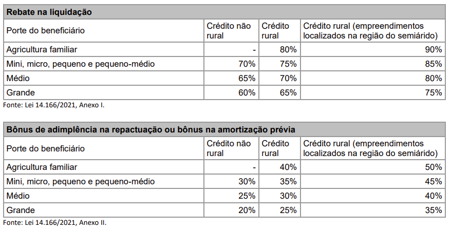 Os descontos oferecidos ao setor rural (que constam nos anexos I e II da Lei 14.166) variavam entre 65% a 90%, no caso de liquidação, e de 25% e 50%, no caso reestruturação do cronograma de reembolso (parcelamento ou reescalonamento do saldo devedor), observadas a atividade econômica, a classificação original de porte do mutuário e a localidade do empreendimento, conforme abaixo:
